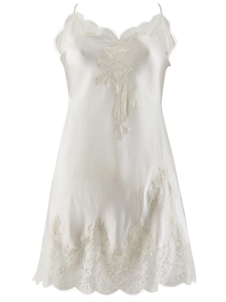 Das Seiden-Negligé ist ca. 88 cm lang und hat feine verstellbare Spaghettiträger. Unten hat es einen ca. 15 cm breiten Spitzensaum aus inkrustierter Spitze. Diese edle Seidenwäsche ist in den folgenden Farben und Größen erhältlich: