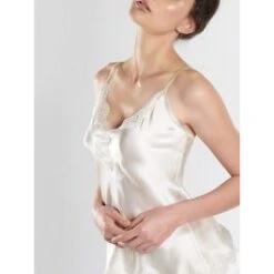 Das Seiden-Top ist ca. 65 cm lang und hat feine verstellbare Spaghettiträger. Unten hat es einen Spitzensaum aus inkrustierter Spitze. Diese edle Seidenwäsche ist in den folgenden Farben und Größen erhältlich: