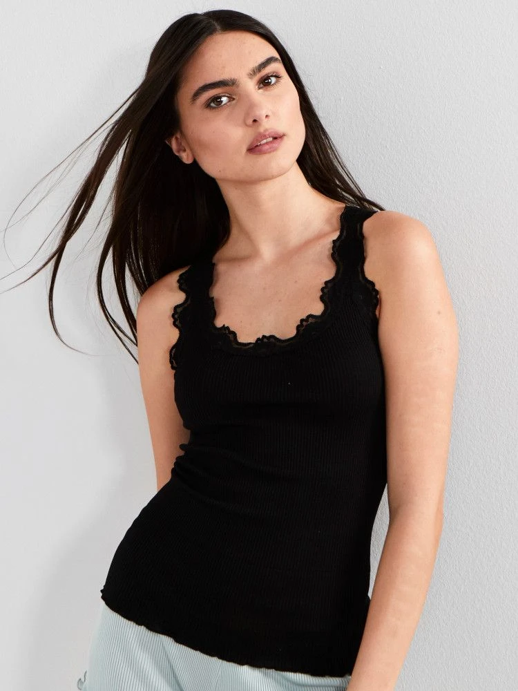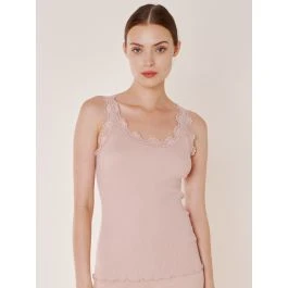Die Hochwertigkeit des Stoffes (70% Seide, 30% Baumwolle) wird durch den zeitlosen Schnitt und die Verzierung mit floraler Wäschespitze (100% Polyester) unterstrichen. Das Unterhemd hat breite Träger und eine unkomplizierte Passform. Es kann als Oberbekleidungsteil, Unterwäsche oder auch als Nachtwäsche und Homewear getragen werden.