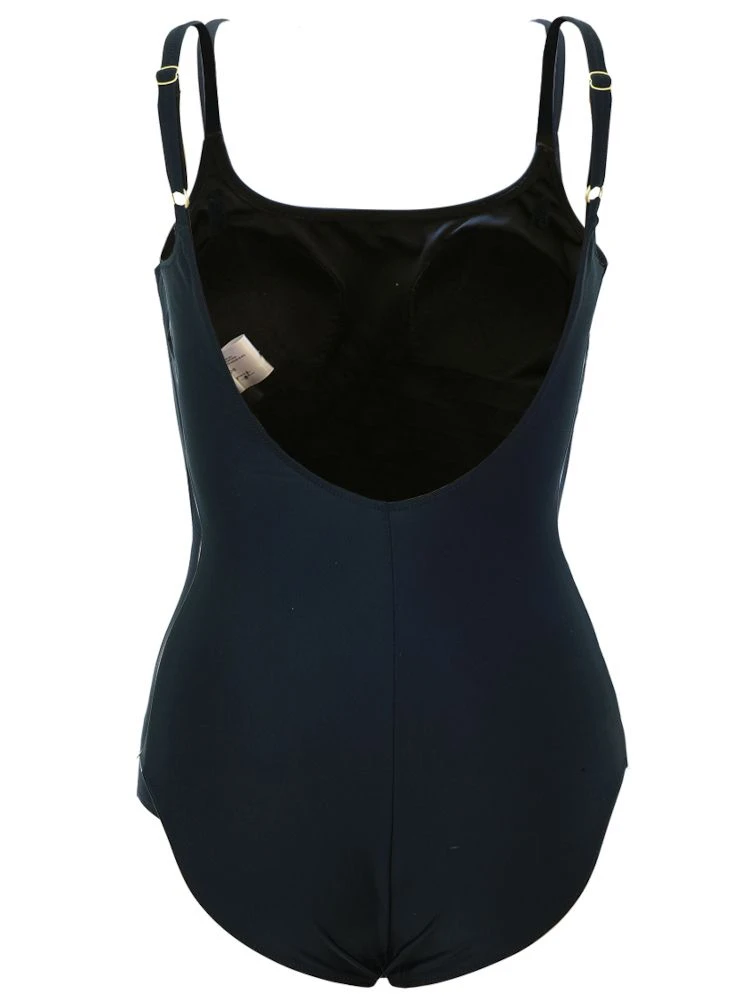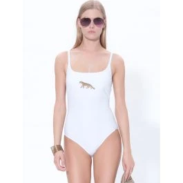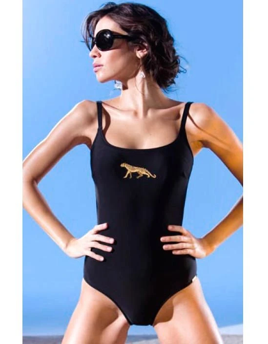 Der Badeanzug Panther von Fürstenberg ist zeitlose Basic-Bademode, welche in vielen Größen erhältlich ist. Die ausgeformten B-Cups sind leicht gepolstert. Unter der Büste ist ein stützender Gummizug eingenäht. Das Decolleté wird von einer sandfarbenen Stickerei eines Panthers geschmückt. Die Träger sind in der Länge verstellbar.