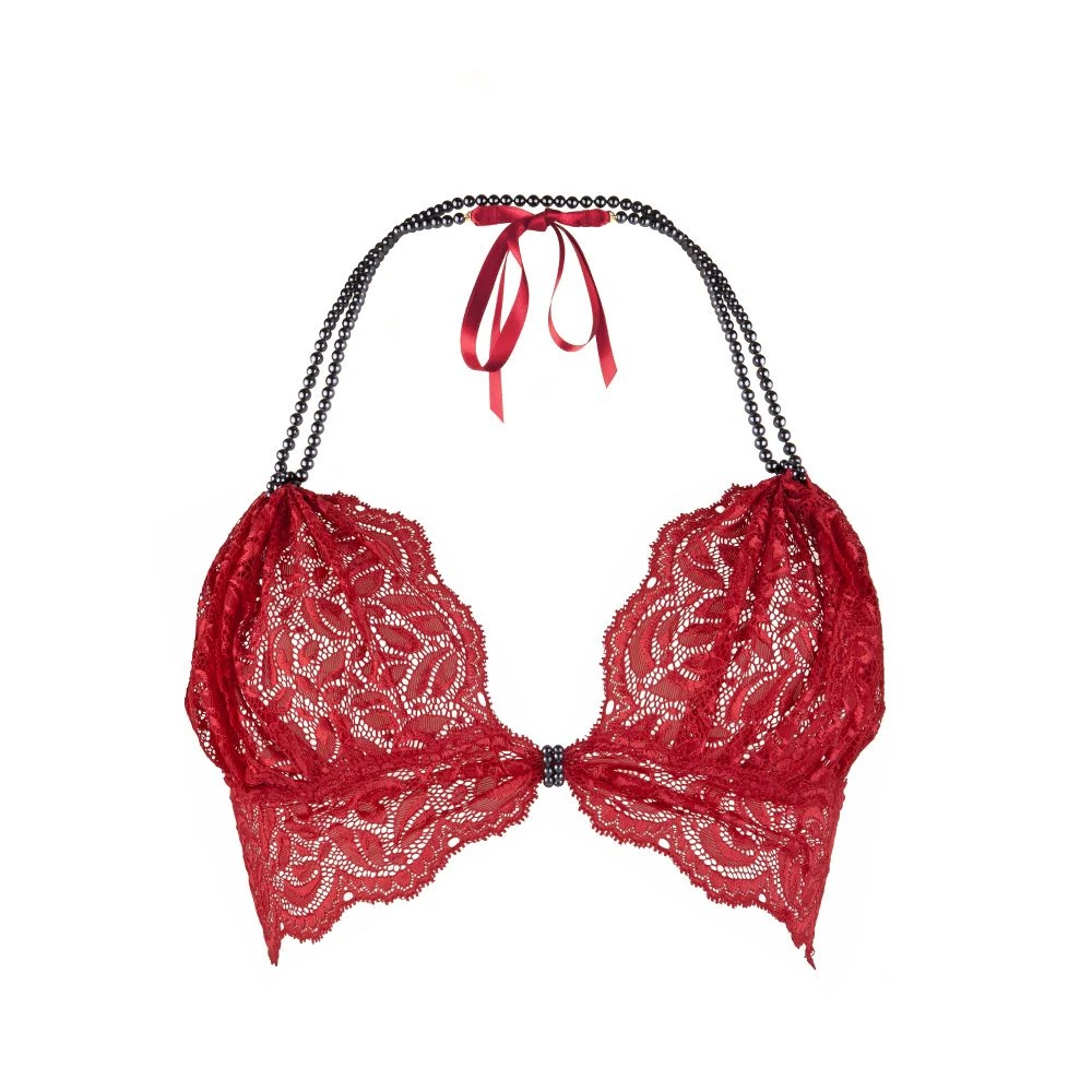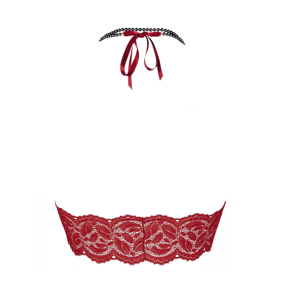 Der Perlen-BH Begos ist in den Farben schwarz oder rot erhältlich. Die doppelt gearbeiteten Träger aus Manacor – Perlen werden mit einem Satin-Schleifchen geschlossen oder können nach Belieben auch komplett abgenommen und als Halskette getragen werden. Das Decolleté ziert ein doppelter Ring aus kleinen Manacor-Perlen.