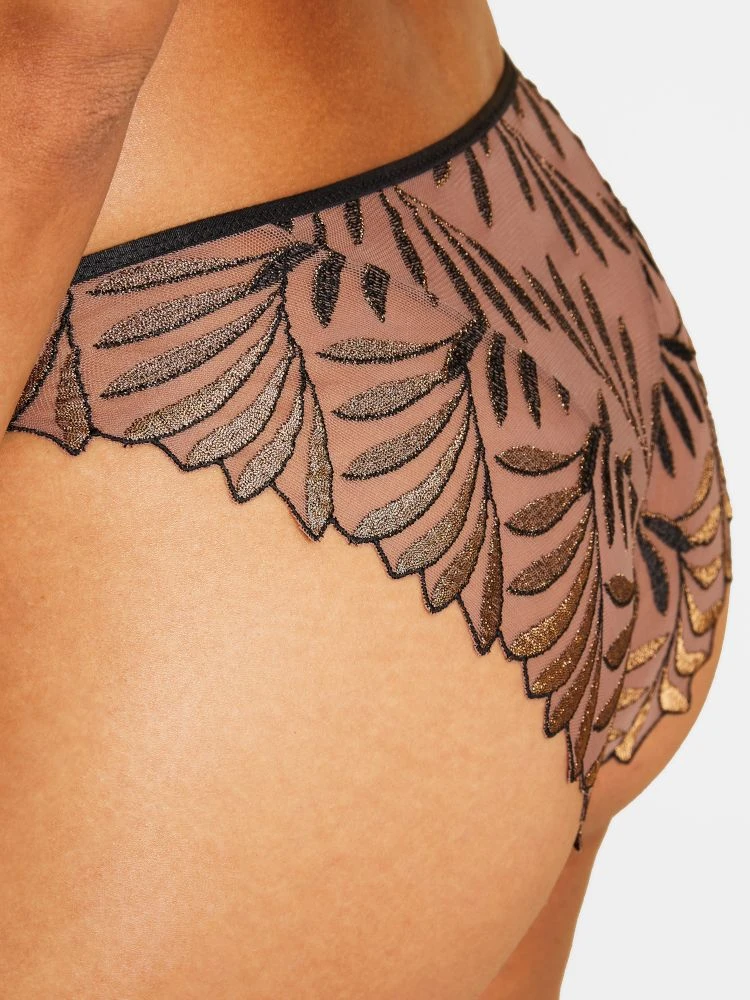 Das designer Dessous ist aufgrund des transparente Tülls leicht durchsichtig. Die goldene Blattstickerei auf dem Nude-Farbenen Tüll machen aus diesem Slip ein verführerisches Wäsche Unterteil. Der Slip in Brasiliana Form hat schwarze Aussennähte und einen Baumwollzwickel im Schritt. Aus der gleichen Kollektion gibt es viele weitere ergänzende Kombinationsteile seperat in unserem Shop.