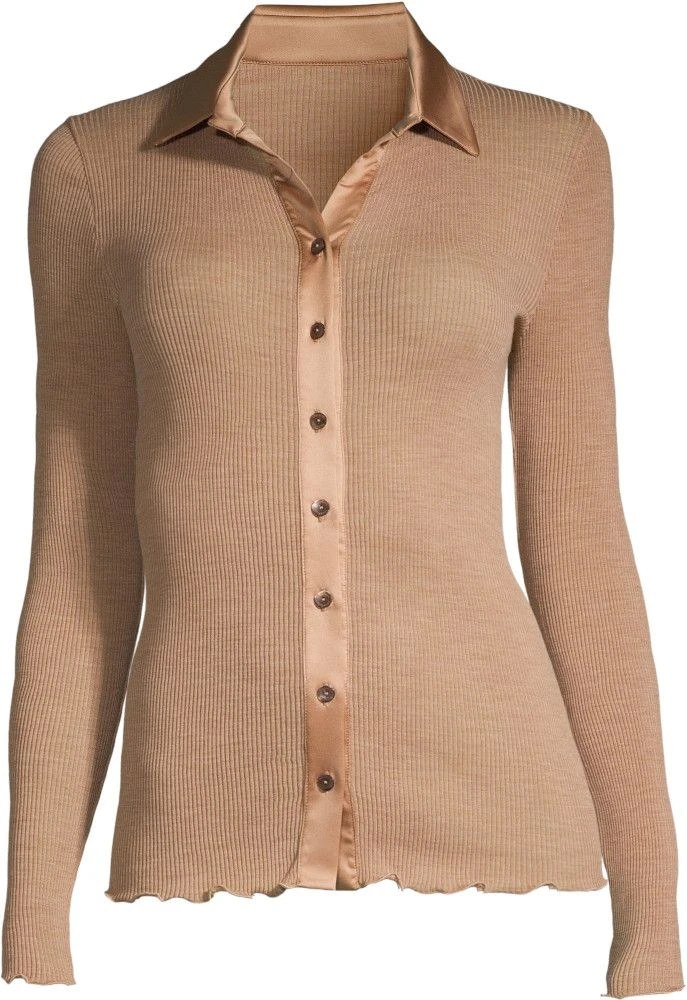Der Langarm Cardigan Wolle-Seide besteht aus einem besonders hochwertigen, rundgestrickten Jersey aus 70% extrafeiner, tasmanischer Merinowolle und 30% Seide. Das kurze Strickjäckchen besteht aus rundgestricktem Rippjersey und ist seitlich nahtlos. Dieser edle Cardigan hat einen Kragen aus Satin und die Gesamtlänge ist ca. 62 cm. Vorne wird er mit zierlichen Knöpfen geschlossen.