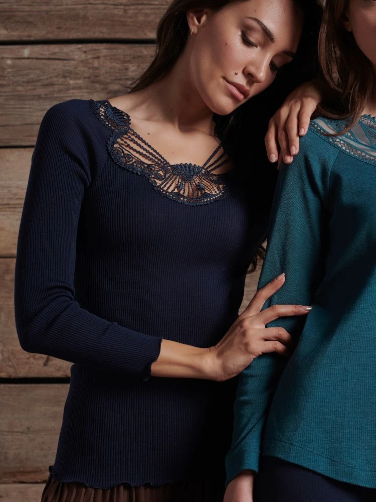 Das Grundmaterial dieser Wäsche Serie ist ein gerippter Wolle-Seide Jersey und in tief dunklem blau erhältlich. Dieses Material ist hautsympathisch und angenehm zu tragen und hat einen zarten Schimmer. Wolle-Seide wirkt temperaturausgleichend, knittert nicht und trocknet schnell. Sie wärmt im Winter und ist ausgleichend in der Übergangszeit. Außerdem ist dieses edle Material leicht elastisch und passt sich daher gut der Körperkontur an.