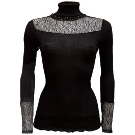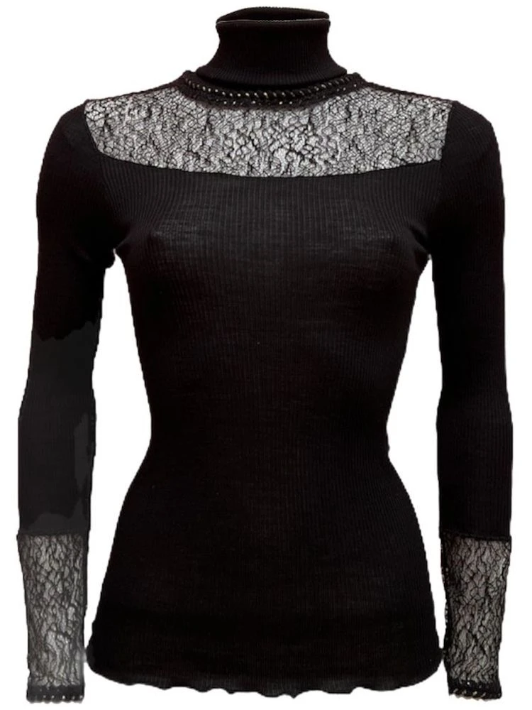 Das Rollkragen Shirt Wolle-Seide besteht aus einem besonders hochwertigen, geripptem Jersey aus 70% extrafeiner Merinowolle und 30% Seide in Kombination mit einer feinen Netzspitze. Dieses edle Rollkragenshirt hat lange Ärmel, eine Gesamtlänge von ca. 60 cm und einen Rollkragen. Das Decolleté ist mit Netz-Spitze gestaltet und das Shirt ist am Hals und den Ärmelenden mit einer dicken Kordel mit Goldglitzer-Details verziert.