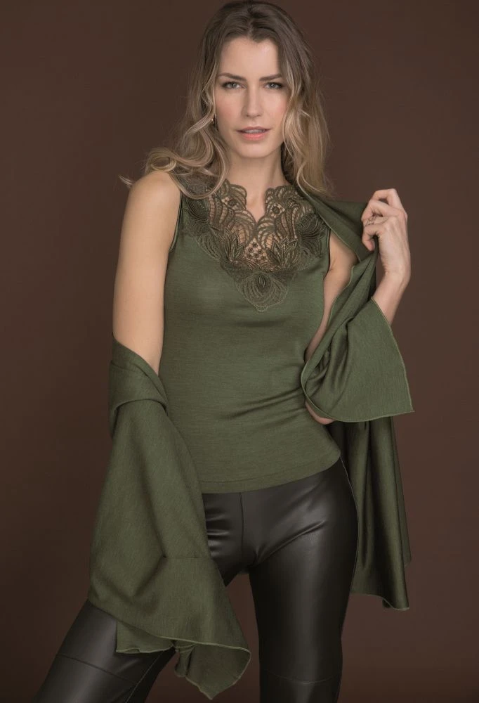 Das Grundmaterial dieser Wäsche Serie ist ein besonders eleganter Jersey, der in klassischen und modischen Farbtönen hergestellt wird. Dieses Material ist hautsympathisch und angenehm zu tragen und hat einen zarten Schimmer. Wolle-Seide wirkt temperaturausgleichend, knittert nicht und trocknet schnell. Sie wärmt im Winter und ist ausgleichend in der Übergangszeit. Außerdem ist dieses edle Material leicht elastisch und passt sich daher gut der Körperkontur an.