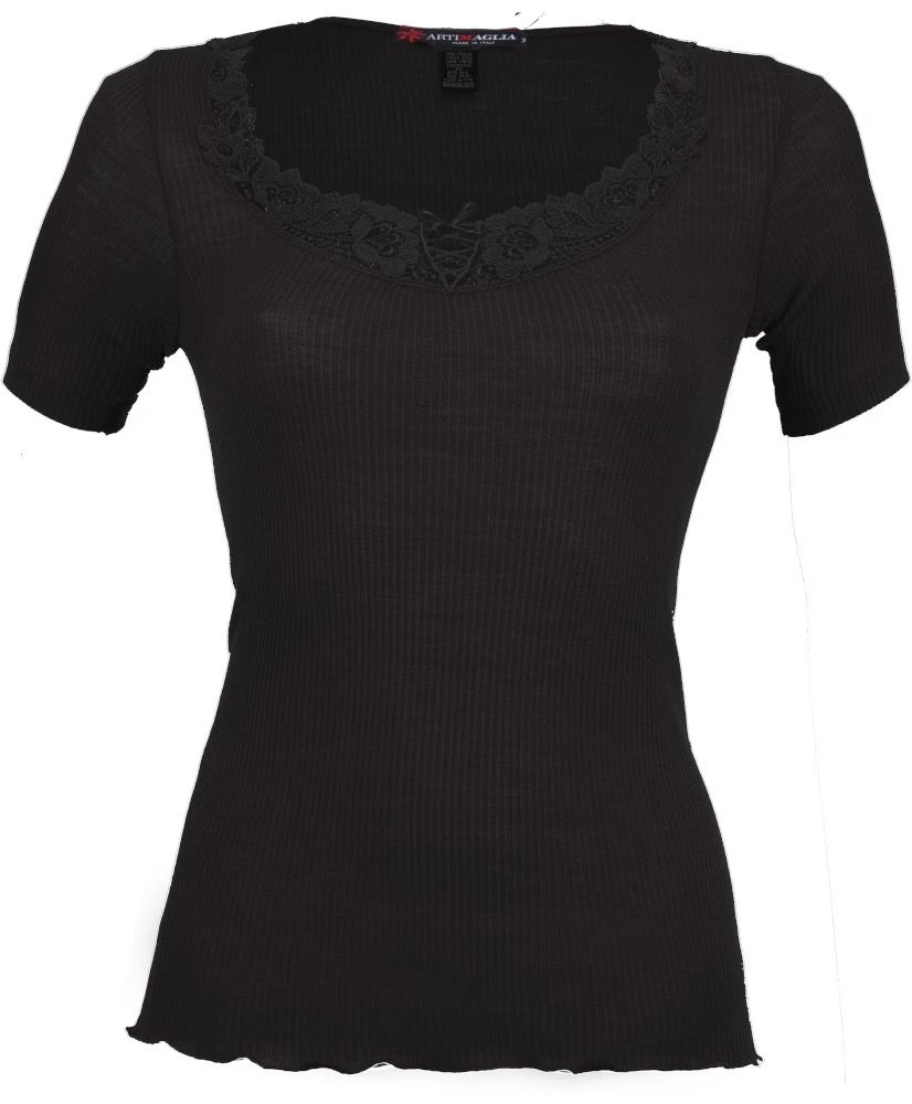 Das feine T-Shirt Wolle-Seide besteht aus einem besonders hochwertigen, rundgestrickten und gerippten Jersey aus 70% extrafeiner Merinowolle und 30% Seide. Dieses edle Shirt mit kurzen Ärmeln ist ca. 60 cm lang. Der untere Saum ist wellig umkettelt. Am Ausschnitt ist dieses Shirt mit einer exquisiten Spitze aus der Schweiz gearbeitet. Das Material ist eine rundgestrickte „Schlauchware“ und daher ist dieses Shirt seitlich nahtlos.