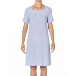 Das Nachtkleid Daniela hat kurze Ärmel. Der runde Ausschnitt ist mit einer bestickten, flieder-farbenen Tüll-Blütenspitze gestaltet. Das Nachthemd hat einen bequemen Schnitt und ist mit ca. 100 cm etwa knielang.