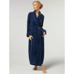 Dieser kuschelige, lange Samt-Morgenmantel ist aus einem ganz besonderen Material gefertigt: Kuscheliger Samt (82% Viscose, 18% Seide) ist zu einem wunderschönen Winteraccessior mit bequemem Schnitt geworden. Der lang geschnittene Samtmantel wird gewickelt getragen und mit einem Bindegürtel geschlossen. Er hat einen Reverskragen, ist ca. 140 cm lang und hat auf beiden Seiten Manteltaschen aufgenäht.