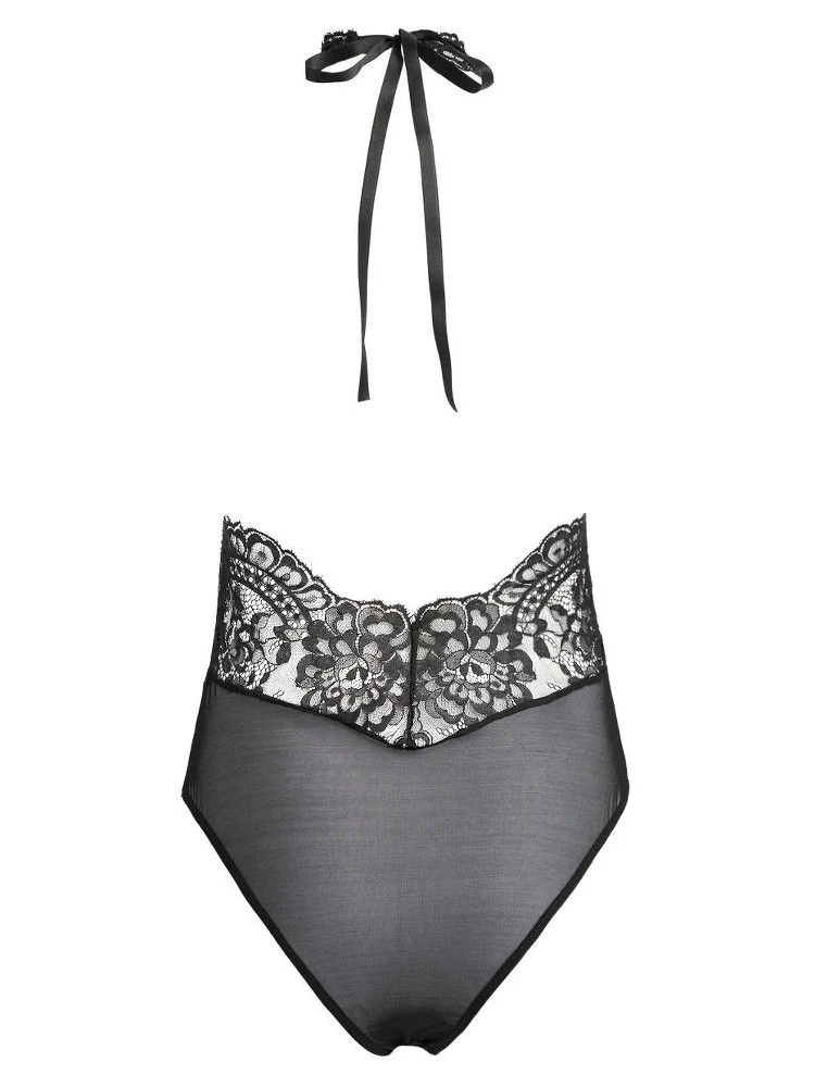 Dieser Body ist im Oberteil aus feiner Blumen Spitze gefertigt und wird als Neckholder gebunden. Unten ist der Body aus transparentem Tüll gefertigt und mit einem kleinen goldener Anhänger mit dem Escora Schlüssel verziert. Der Rücken ist tief ausgeschnitten und durch Bindebändchen im Nacken und im Decolleté kann die Größe etwas reguliert werden. Der Body ist im Schritt NICHT zu öffnen. Er ist ungefüttert und daher transparent.