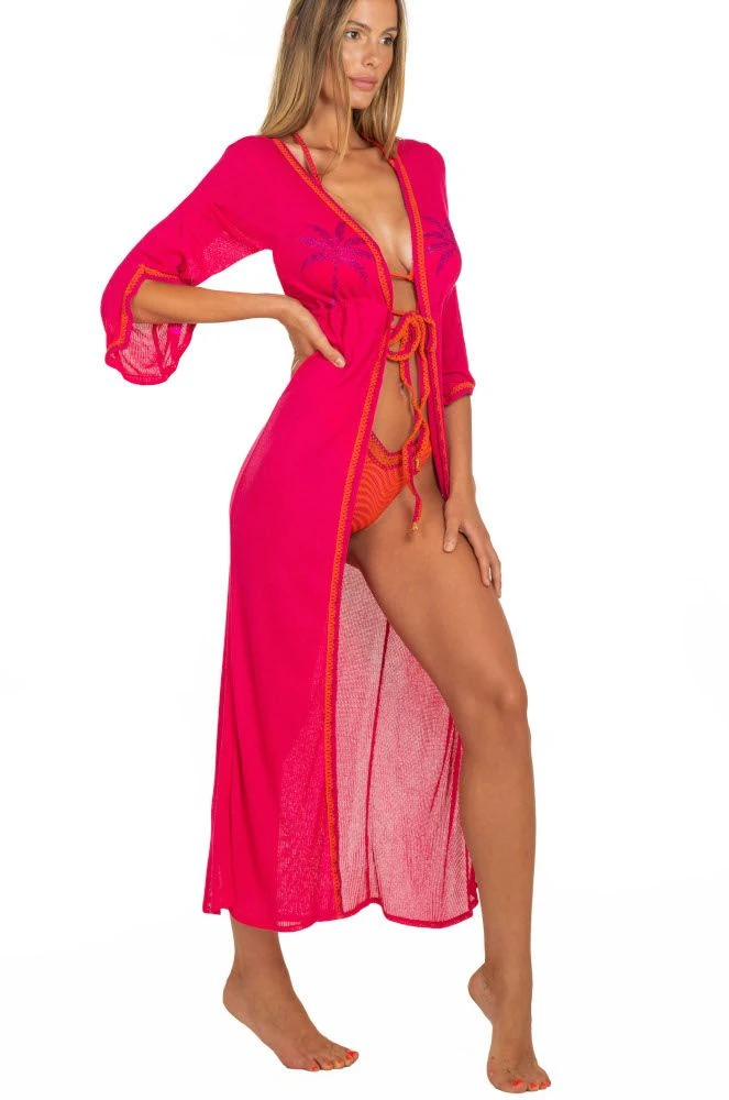 Der lange Strandmantel von Pin-Up Stars besteht aus angenehm weichen Viscose Strickgewebe, kombiniert mit attraktiver Häkelborte. Der Mantel ist mit einem Lurexflock Palmenmuster bedruckt. Er ist italienische Designer Beachwear und in den Größen S bis L erhältlich. Ausverkaufte Größen sind hier nicht nachbestellbar. Es hat 3/4-lange Ärmel und wird mit einem Bindebändchen geschlossen.