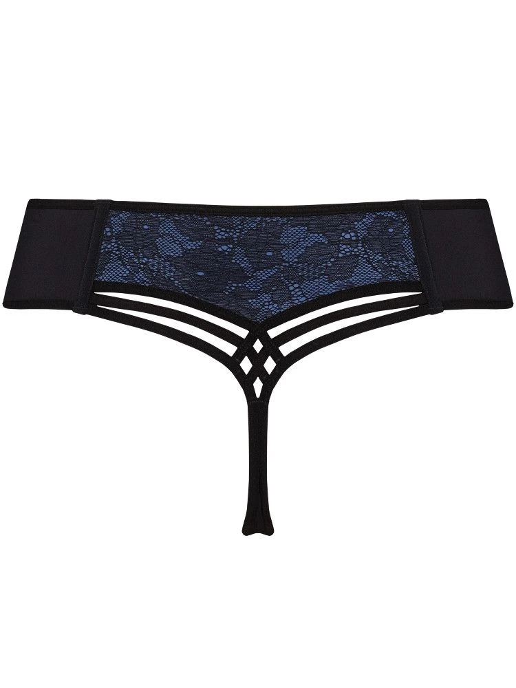 Der seitlich ca. 7 cm breite String ist vorne aus schwarzem Jersey gefertigt. Auf der Rückseite hat er einen Einsatz aus blauem Jersey mit Spitze und ist mit einem kleinen Einsatz im Schnürlook verziert. Der String hat elastische Abschlüsse und einen Innenzwickel aus Baumwolljersey.