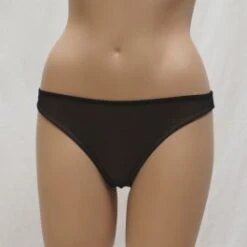 Dieser Tüll String besteht aus elastischem schwarzem Tüll, welcher vorne hautfarben unterfüttert ist. Ein kleines schwarzes Schleifchen ist auf der Rückseite mittig appliziert.