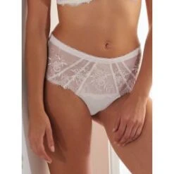 Der Hohe Slip Cravache ist eine luxuriöse Lingerie aus Spitze der französischen Edel-Dessous Marke Millesia. Der Taillenslip besteht aus besticktem Tüll, der zum Rand in eine Richelieu Stickerei übergeht. Im unteren Bereich ist dieser Hohe Slip aus unbesticktem Tüll gefertigt und daher transparent.