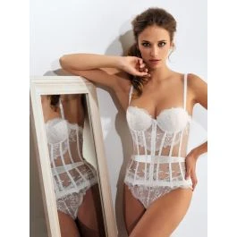 Das Torselett Cravache ist eine luxuriöse Spitze Lingerie der französischen Edel-Dessous Marke Millesia. Die Corsage mit Strapsen hat leicht ausgeformte, gefütterte 3/4-Cups. Die Schalen mit Bügel sind auf der Außenseite mit bestickter Tüllspitze mit floralen Blütenmotiven bezogen, welche am Rand in eine Art Richelieu Stickerei übergeht.